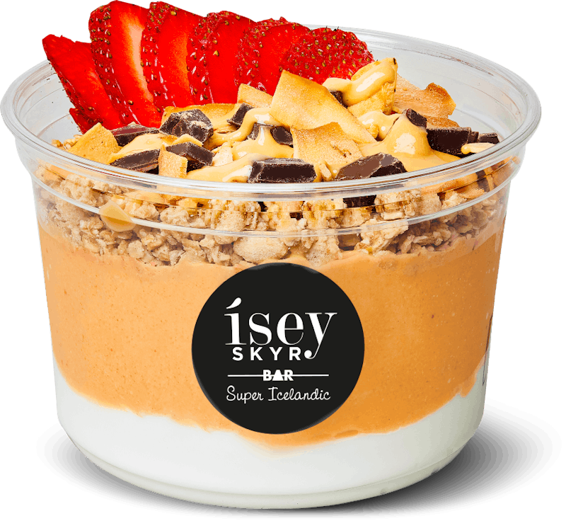 ON THE TOP: Granola, strawberry, salted caramel coconut flakes, peanut butter, dark stevia chocolate